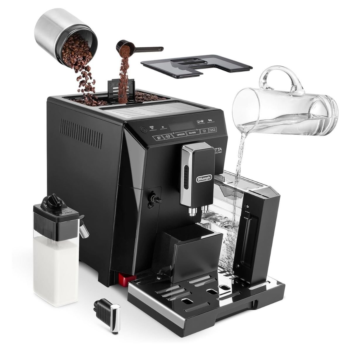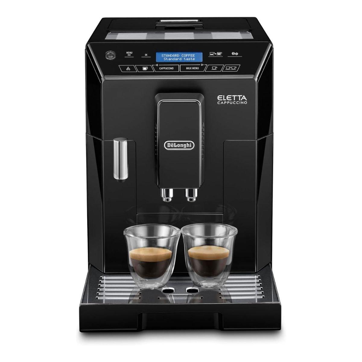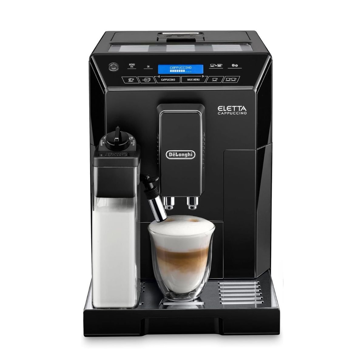 Savour every moment with DeLonghi Eletta Cappuccino, De’Longhi’s innovative automatic coffee machine. From aromatic espresso to creamy cappuccino, customise your perfect cup at the touch of a button and enjoy the authentic Italian coffee shop experience from the comfort of your home. This streamlined, black coffee maker will add a touch of style to any modern home.